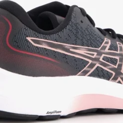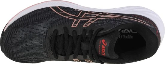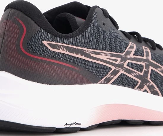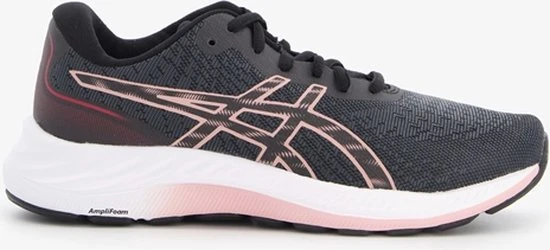 Zwarte GEL-EXCITE 9-hardloopschoenen van Asics voor dames. De GEL-EXCITE 9-hardloopschoenen van Asics zijn ontwikkeld om uitstekend comfort te bieden. De schoenen zijn voorzien van roze merkopdrukken en roze details in de zool. De leest wordt gecombineerd met een voorgevormd hielgedeelte dat je voet meer gecentreerd op het platform van de schoen houdt. Dit model biedt verbeterd comfort met GEL™-technologie. De GEL –technologie houdt in dat op plekken in de schoen, waar de voet de grond raakt, de impacts en schokken vermindert worden dankzij speciaal ontwikkelde siliconen delen. De AMPLIFOAM™-tussenzool en de ORTHOLITE™-sockliner voor een zacht en comfortabel gevoel onder de voeten. AMPLIFOAM™ materiaal is duurzaam en zorgt voor zeer zachte demping. De ORTHOLITE™-sockliner is een uitneembare en wasbare zool die zich vormt naar de voet en zorgt voor vering.