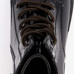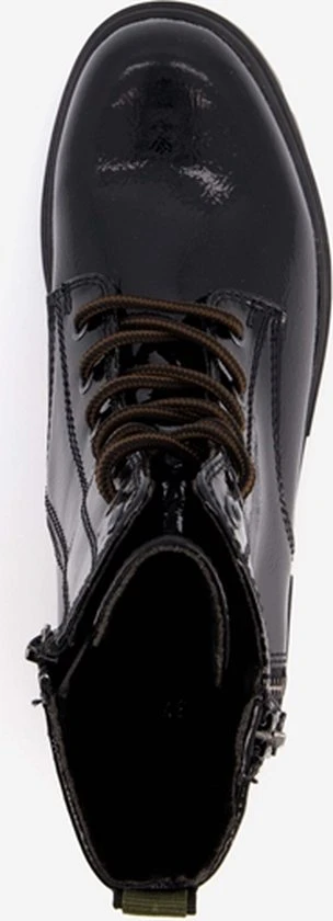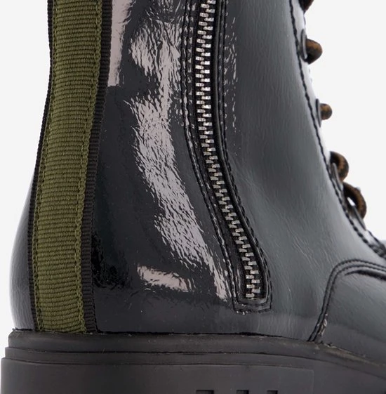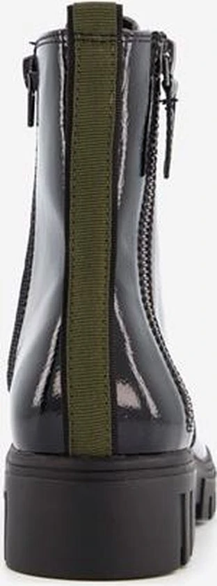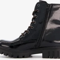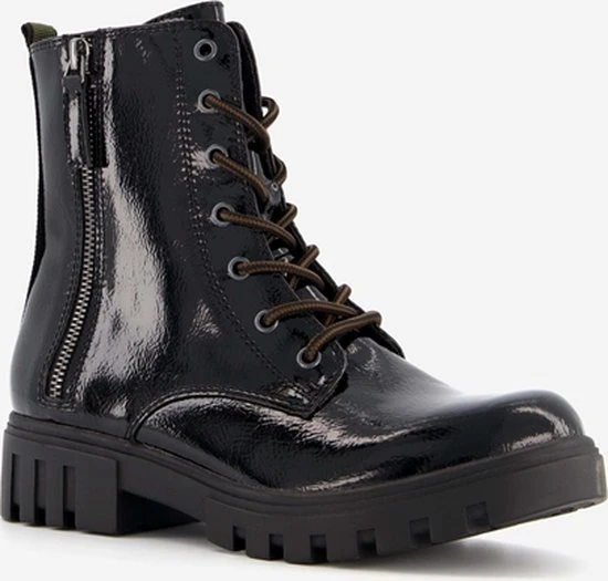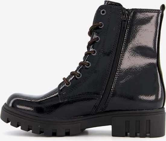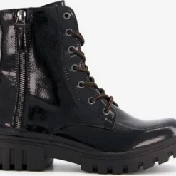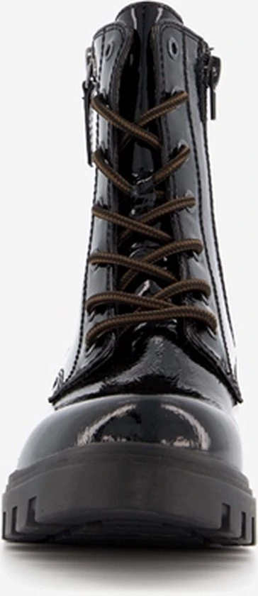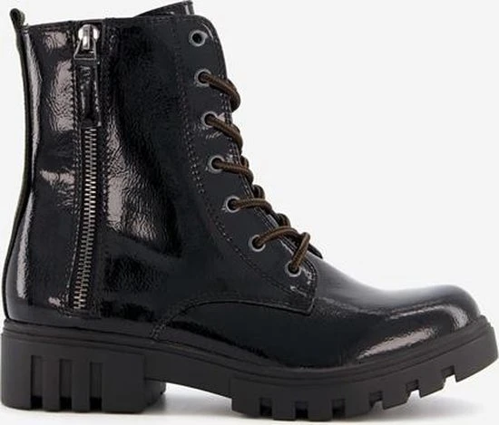 Zwarte veterboots voor dames van Blue Box. Gemaakt van imitatieleer, een binnenwerk van textiel en een stevige profielzool. De boots hebben een vetersluiting en rits aan de binnenzijde voor een makkelijke instap. Het comfortabele voetbed is gemaakt van textiel. Deze is niet uitneembaar. De veterboots hebben lak op het bovenwerk en een decoratieve rits aan de buitenzijde. De boots hebben een lage hak van circa 1,5 cm en een schachthoogte van 15 cm.