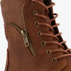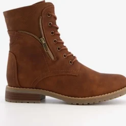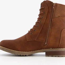 Cognac bruine enkellaarsjes voor dames. Gemaakt van imitatieleer, een binnenwerk van textiel en een stevige profielzool. De gevoerde laarsjes hebben vetersluiting en een ritssluiting aan de binnenzijde. Voorzien van een decoratief ritsje aan de buitenzijde. De vaste binnenzool is gemaakt van textiel. De enkellaarsjes hebben een warme voering en een lage hak van circa 2 cm. De schachthoogte bedraagt 15 cm.