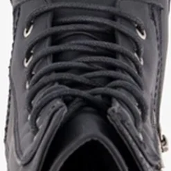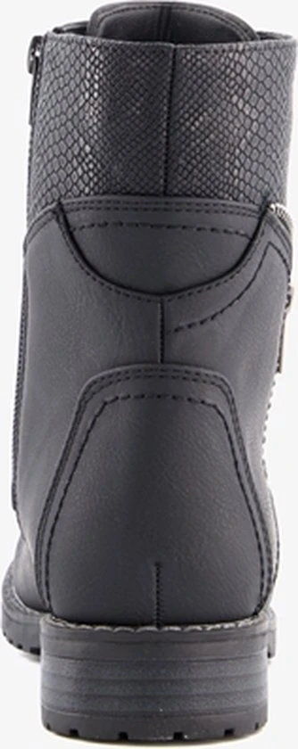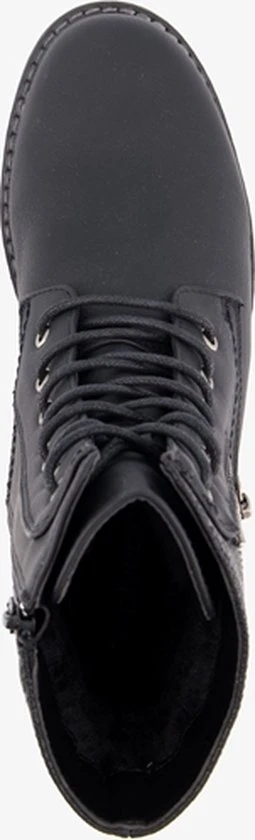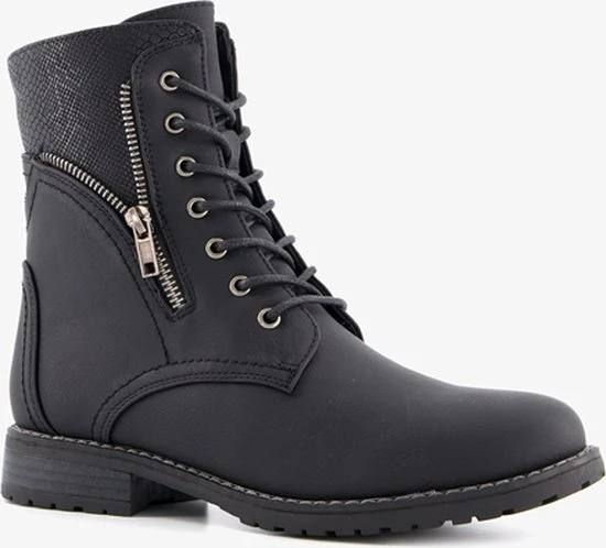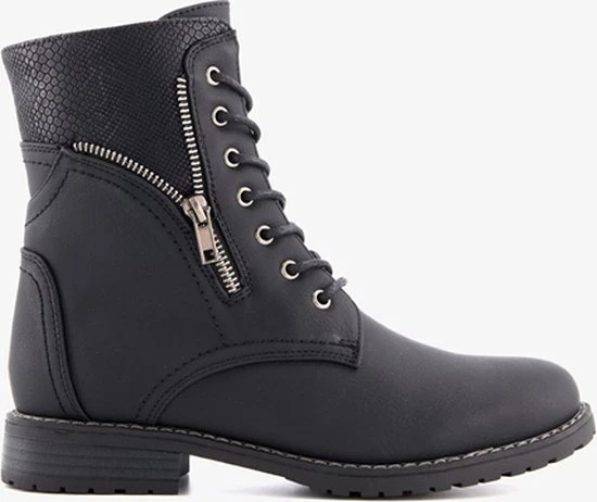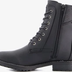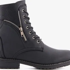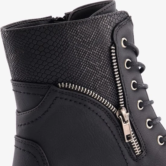 Zwarte veterboots voor dames van Blue Box. Gemaakt van imitatieleer, een binnenwerk van textiel en een stevige profielzool. De laarsjes hebben vetersluiting, ritssluiting aan de binnenzijde en een decoratieve rits aan de buitenzijde. De vaste binnenzool is gemaakt van textiel. De enkellaarsjes hebben een schachthoogte van 16 cm en een laag hakje van circa 2 cm.