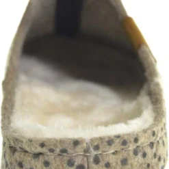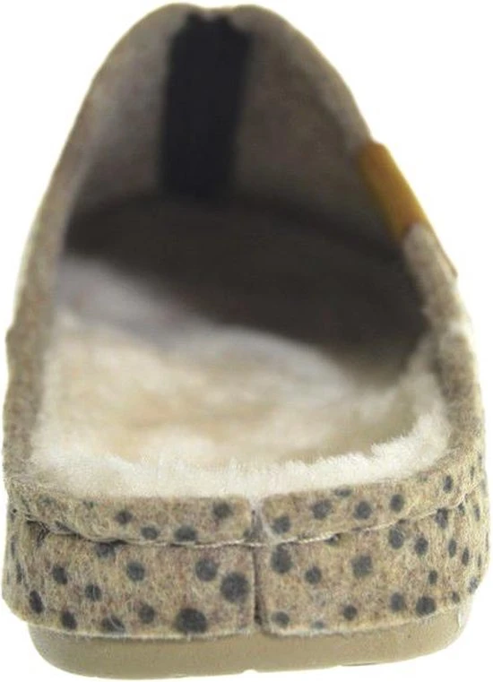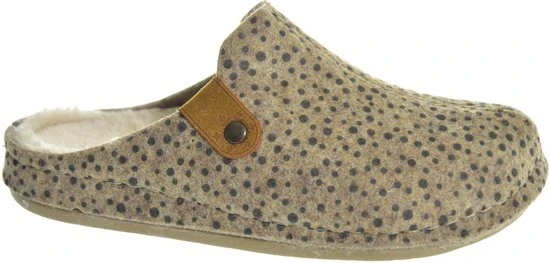 Cloxx Home dames pantoffel muil, uitgevoerd in beige vilt met stippenprint. De pantoffel heeft een warme textiel voering en een harde kunststof zool. Deze pantoffel bevat gerecycled PET flessen onderdelen.