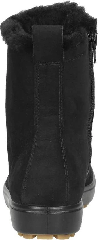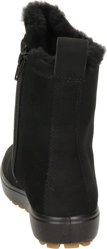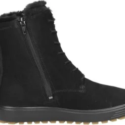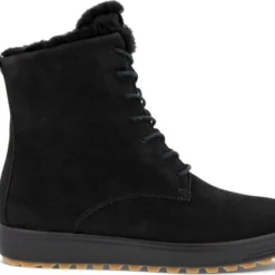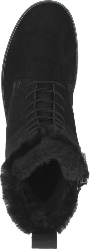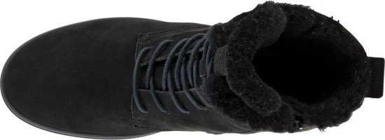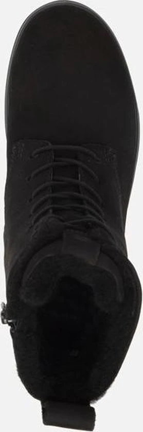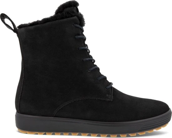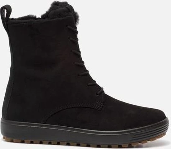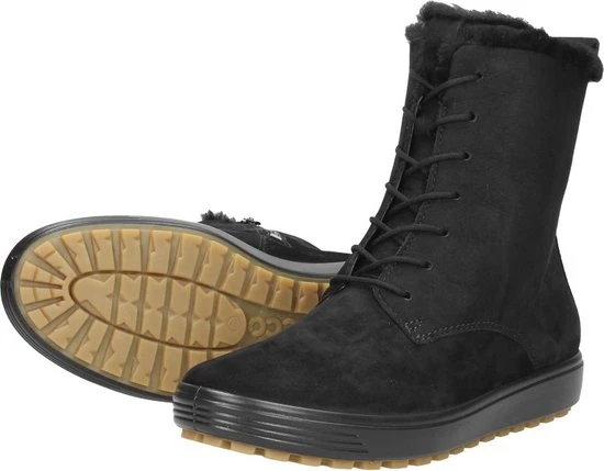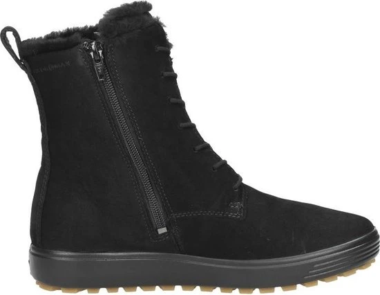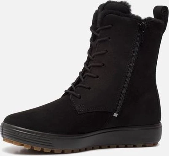 Deze zwarte Ecco Soft 7 Tred W veterboots zijn ideaal voor de winter! De boots zijn gemaakt van nubuckleer, met een warme voering van imitatiebont. Hierdoor blijven jouw voeten heerlijk warm. De comfortabele binnenzool is gemaakt van textiel. De schoen is voorzien van de Hydromax-technologie. Dit betekent dat de boots waterafstotend zijn waardoor jouw voeten heerlijk droog blijven. Ter decoratie zijn er stikels, verschillende inzetten en merkopdrukken aangebracht. Door middel van een rits- en vetersluiting kan de schoen gesloten worden. Het aantreklusje aan de achterkant helpt je bij het instappen waardoor het aan- en uittrekken nog gemakkelijker gaat. De rubberen zool met grof profiel heeft een dikte van 2 centimeter. Het voetbed van de zwarte Ecco Soft 7 Tred W veterboots is uitneembaar.
