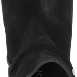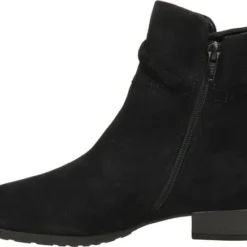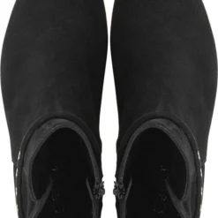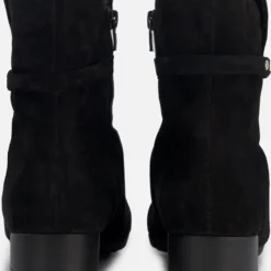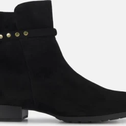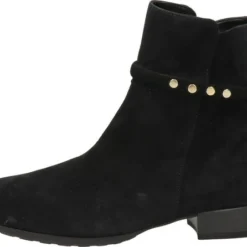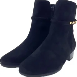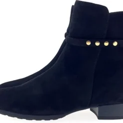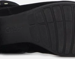 Suède enkellaars voor dames van het merk Gabor. Deze enkellaars met ronde neus is uitgevoerd in zwart suède. De binnenzijde van de schacht bevat een rits en rondom de schacht is een bandje aangebracht met goudkleurige studs. De binnenkant bestaat uit leer en een stevig contrefort draagt bij aan het draagcomfort. De rubberen loopzool heeft een grof profiel en de hak meet circa 2,5 cm.