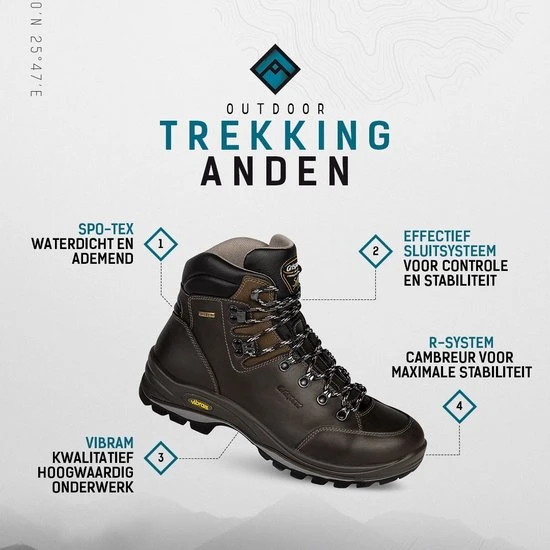 De Anden is een schoen uit de Trekking collectie van Grisport. Deze stevige en stoere wandelschoenen hebben een hogere schacht, een goed profiel en bieden extra ondersteuning tijdens bergtochten of wandelingen met bepakking op ruw terrein. De Anden is uitgevoerd met een Vibram zool. Deze staat garant voor een kwalitatief hoogwaardig onderwerk van de schoen. Het biedt comfort, kwaliteit op lange termijn en perfecte controle op de ondergrond. Het waterdichte en ademende Spo-Tex membraan is tussen de verschillende lagen van de schoen verwerkt. De schoen is voorzien van een R-system, dit is een sterke van nylon gemaakte cambreur en zorgt voor maximale stabiliteit.