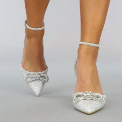 Zilveren dames muiltjes. Schoenen kopen? Kijk vooral niet verder wij verkopen topkwaliteit dames schoenen voor een betaalbare prijs. Prachtige party hakken met glitter en strikdetail. Designer look hakken.