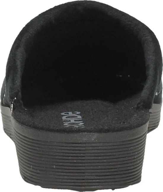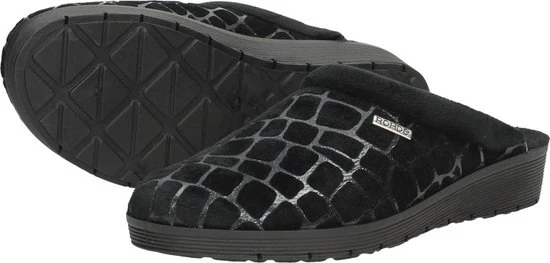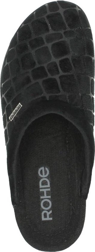 Rohde dames pantoffel muil in zwart met print model 2339, gemaakt van microvelours , net zoals de comfortabele binnenzool en de voering. De rubberen zool van de pantoffel loopt bij de hak iets omhoog en heeft daar een dikte van 3 centimeter. De pantoffel is voorzien van een G leest, wat betekent dat ze normaal vallen.