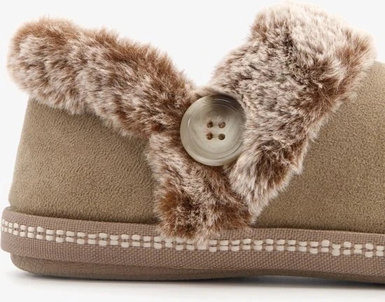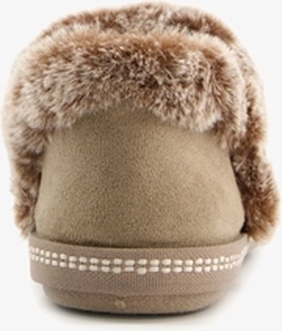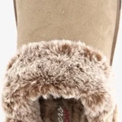 Taupe kleurige Skechers Cozy Campfire gevoerde dames pantoffels. Gemaakt van textiel, een binnenwerk van textiel en een stevige zool. De pantoffels hebben een elastische instap met een knoopje aan de buitenzijde. Voorzien van een warme voering van imitatiebont. De pantoffels van Skechers zijn hierdoor lekker warm en dankzij het memory foam voetbed zitten ze ook nog eens heerlijk!