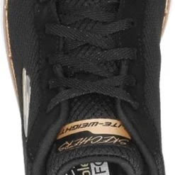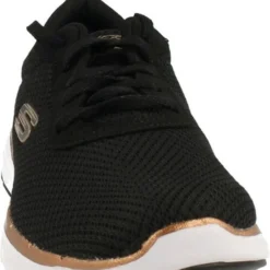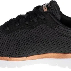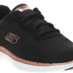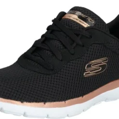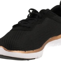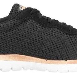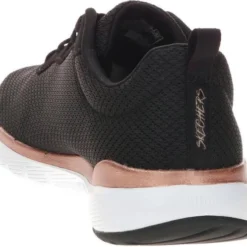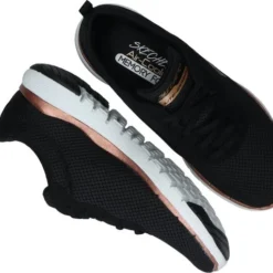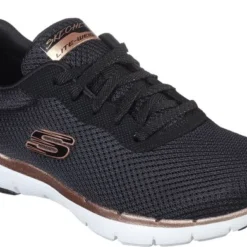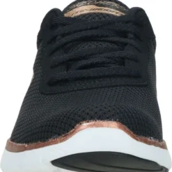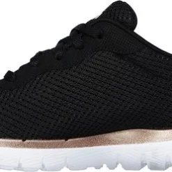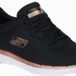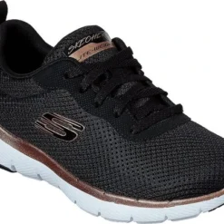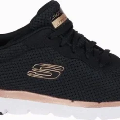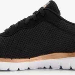 Zwarte Skechers Flex Appeal 3.0 dames sportschoenen. Deze comfortabele, lichte sneakers hebben een buitenwerk van ademend mesh. Voorzien van merkopdrukken op het buitenwerk en subtiele gouden accenten. Deze Flex Appeal sneakers hebben een vetersluiting en een handig aantreklusje op de hiel voor een makkelijke instap. Het comfortabele voetbed is gemaakt van textiel en bevat memory foam.
