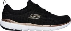 Zwarte Skechers Flex Appeal 3.0 dames sportschoenen. Deze comfortabele, lichte sneakers hebben een buitenwerk van ademend mesh. Voorzien van merkopdrukken op het buitenwerk en subtiele gouden accenten. Deze Flex Appeal sneakers hebben een vetersluiting en een handig aantreklusje op de hiel voor een makkelijke instap. Het comfortabele voetbed is gemaakt van textiel en bevat memory foam.