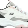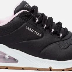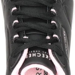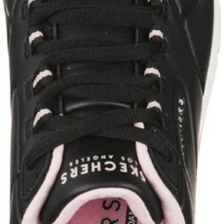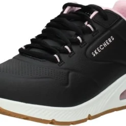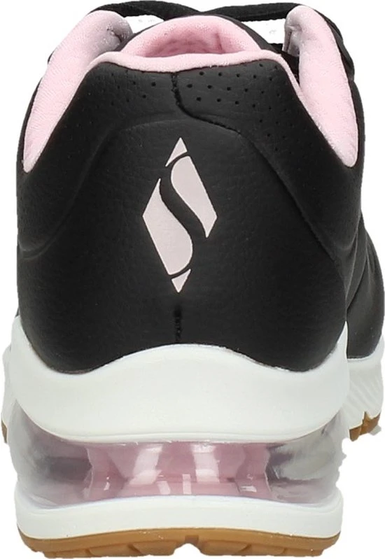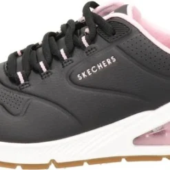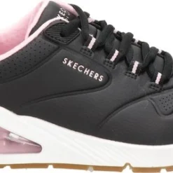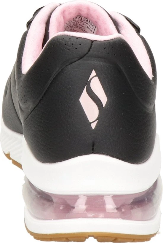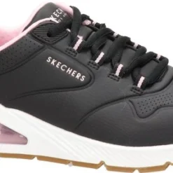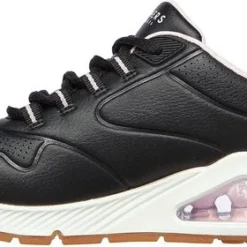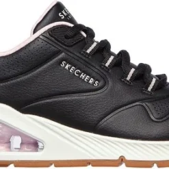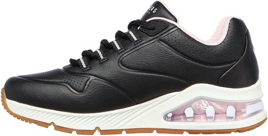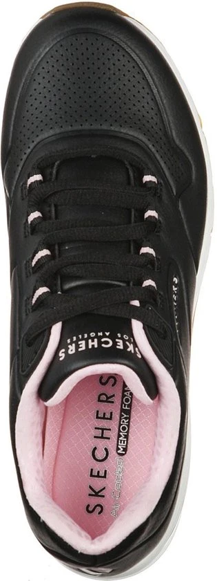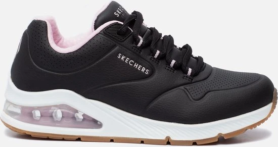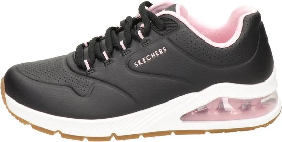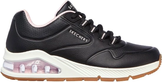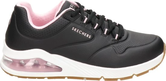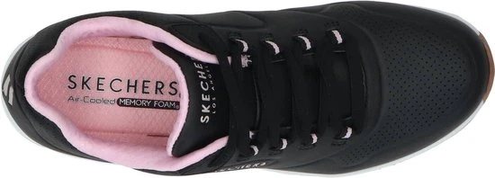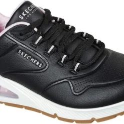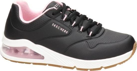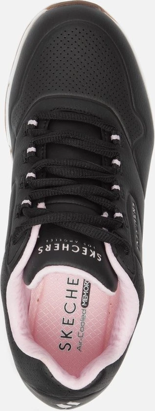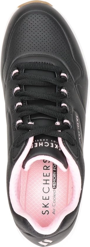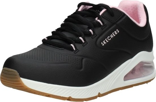 De populaire Skechers Uno 2 2nd Best sneakers zijn super comfortabel! De zwarte sneakers zijn gemaakt van synthetisch materiaal en hebben een glad geperforeerd bovenwerk. De roze voering is gemaakt van textiel. Het Air-cooled Memory Foam voetbed past zich aan aan de voet, absorbeert schokken en werkt ventilerend. De sneaker heeft een ‘wedge-pasvorm’ door de verborgen hak van 2,5 centimeter. Met de vetersluiting kan je de schoenen afstellen naar jouw wensen. De tussenzool heeft een Skech-Air middenzool met een zichtbaar schokabsorberend hielkussen. De rubberen buitenzool is flexibel en biedt veel grip tijdens het lopen. Deze Skechers Uno 2 2nd Best sneakers hebben een vast voetbed.
