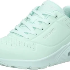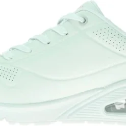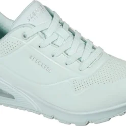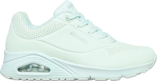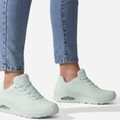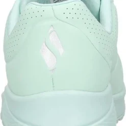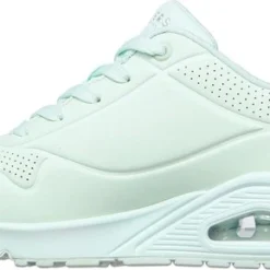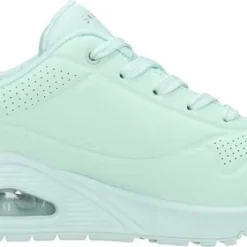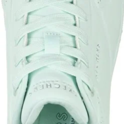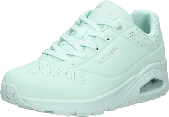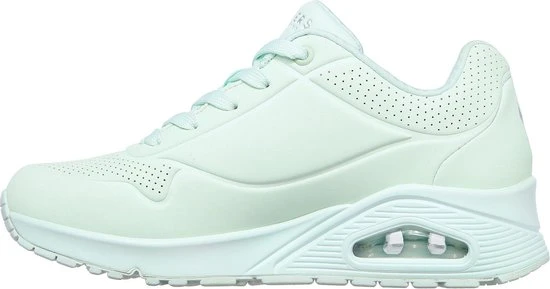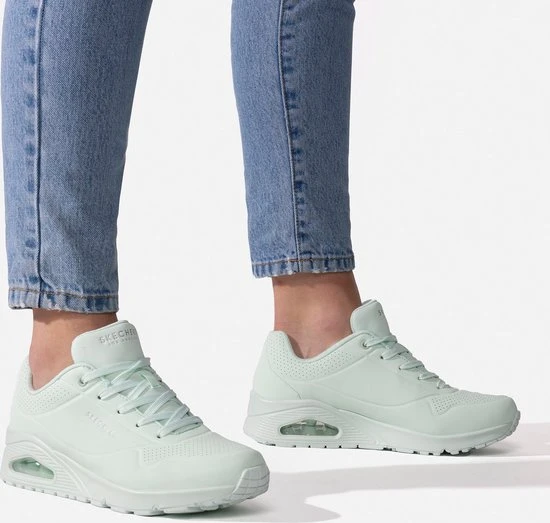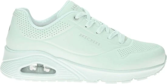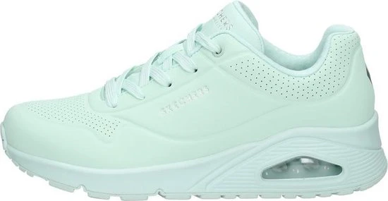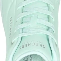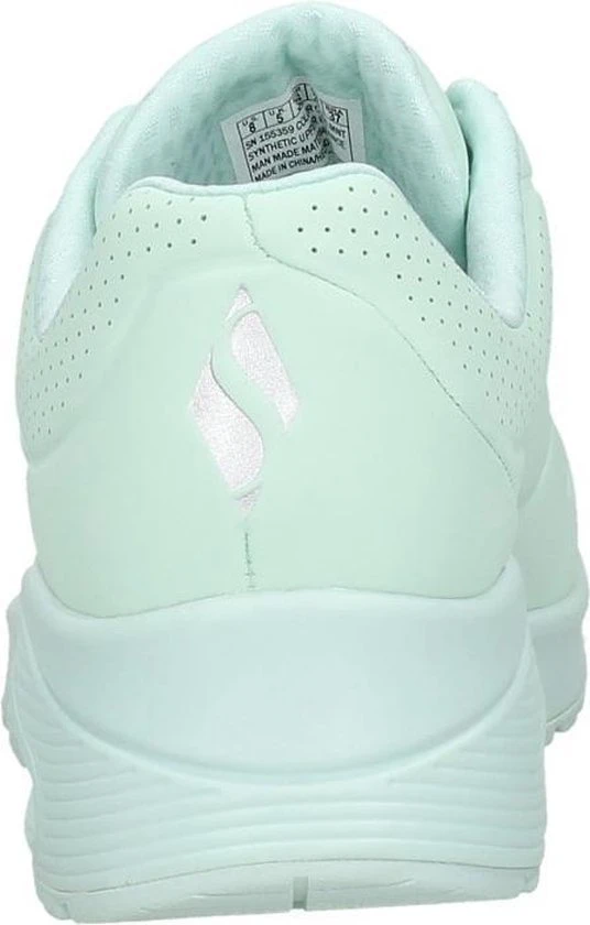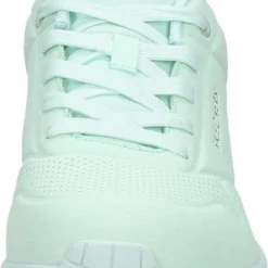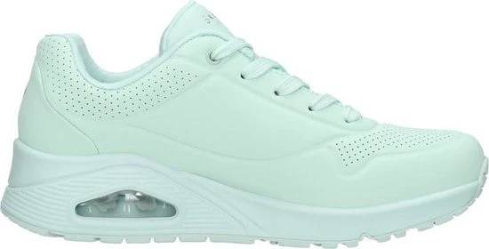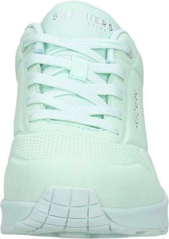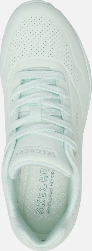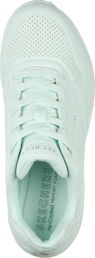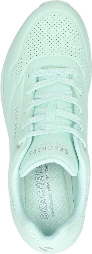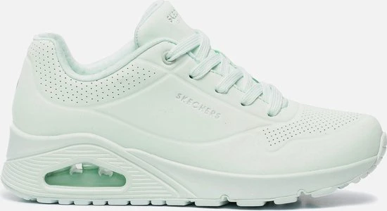 Groene Skechers Uno Frosty Kicks, met een bovenkant van synthetisch materiaal. De voering bestaat uit textiel, net als de comfortabele binnenzool. De sneakers zijn voorzien van kleine perforaties en verschillende stiksels en inzetten. Dankzij het voetbed met Air Cooled Memory Foam biedt de schoen veel demping. De zool is gemaakt van rubber en heeft een dikte van 3 centimeter. Het voetbed van deze Skechers Uno Frosty Kicks is niet uitneembaar.