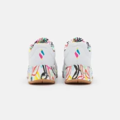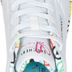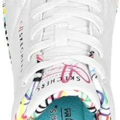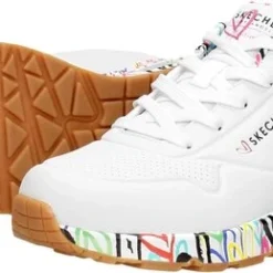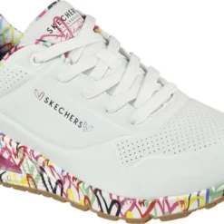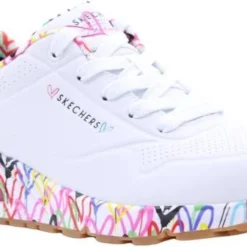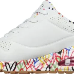 In samenwerking met artiest James Goldcrown heeft Skechers deze Uno Loving Love sneakers ontworpen. James Goldcrown staat bekend om zijn ‘Love walls’ die op verschillende plekken in de wereld te vinden zijn. De vrolijke hartjesprint vind je nu ook op de zolen en de voering van deze populaire Skechers sneakers. Het bovenwerk is gemaakt van synthetisch materiaal en de schoenen hebben een voering en binnenzool van textiel. Het Air-Cooled Memory Foam zorgt voor urenlang loopcomfort en heeft een ademende werking. De zichtbare Skech-Air luchtkussen vangt schokken op bij iedere stap. De witte Skechers Uno Loving Love sneakers hebben een vast voetbed.
