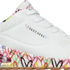 In samenwerking met artiest James Goldcrown heeft Skechers deze Uno Loving Love sneakers ontworpen. James Goldcrown staat bekend om zijn ‘Love walls’ die op verschillende plekken in de wereld te vinden zijn. De vrolijke hartjesprint vind je nu ook op de zolen en de voering van deze populaire Skechers sneakers. Het bovenwerk is gemaakt van synthetisch materiaal en de schoenen hebben een voering en binnenzool van textiel. Het Air-Cooled Memory Foam zorgt voor urenlang loopcomfort en heeft een ademende werking. De zichtbare Skech-Air luchtkussen vangt schokken op bij iedere stap. De witte Skechers Uno Loving Love sneakers hebben een vast voetbed.