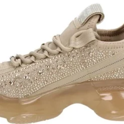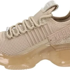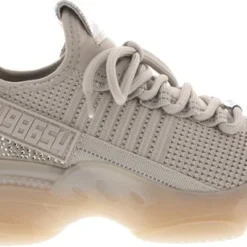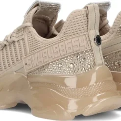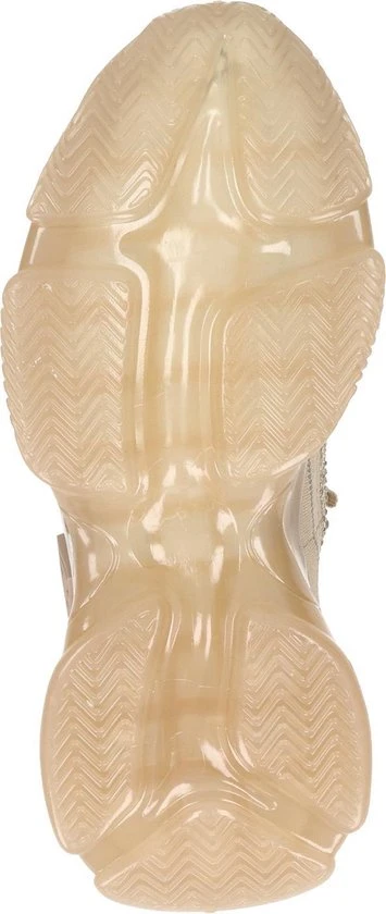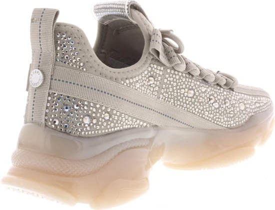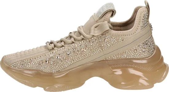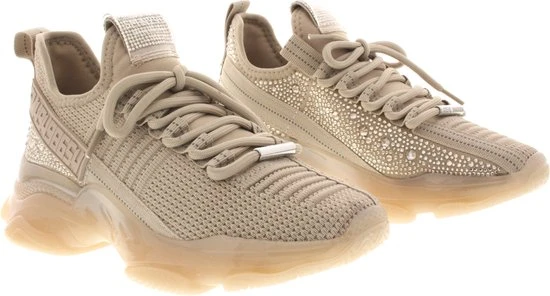 Maak een statement met deze beige chunky sneaker Maxilla-R van het merk Steve Madden. Het bovenwerk is gemaakt van strak geweven textiel met opvallende details. Zo zijn er opstaande stiksels te vinden op de neus en zijkant, is er op de zijkant een rubber merklogo te vinden en zijn de veters en hiel gesierd met een metaal merkplaatje. Extra leuk is het transparante merklabel op de tong die gesierd met glinsterende strass steentjes net zoals de hiel voor een fabulous look. Het binnenwerk is gemaakt van zacht en soepel neopreen wat heerlijk aanvoelt aan je voeten en in combinatie met het uitneembare dempende voetbed en de superlichte loopzool lijkt het net alsof je op wolken loopt. De hoogglanzende chunky zool is gemaakt van rubber met golvende lijnen voor een stoere touch. Bij de voorvoet is dit model 2,5 centimeter hoog en loopt naar achteren toe op tot maar liefst 5 centimeter hoogte. De semitransparante loopzool is speels afgewerkt met zwarte inzet stukken met een golvende profiel voor enorm vele grip en een goede demping. Draag ‘m bij een toffe jeans of een zwierige jurk en je valt lekker op!