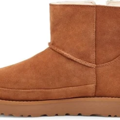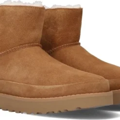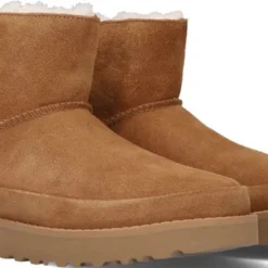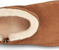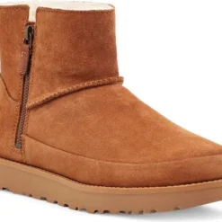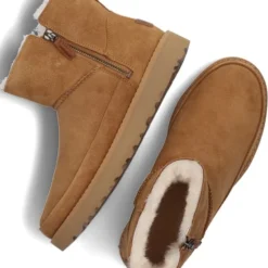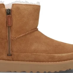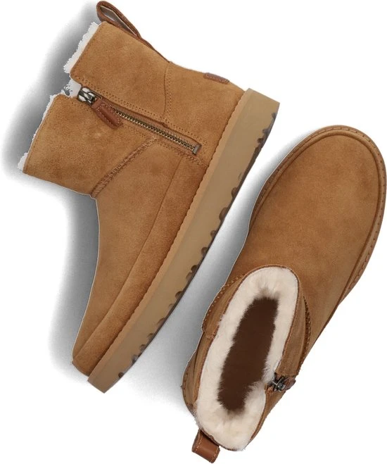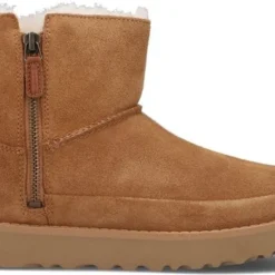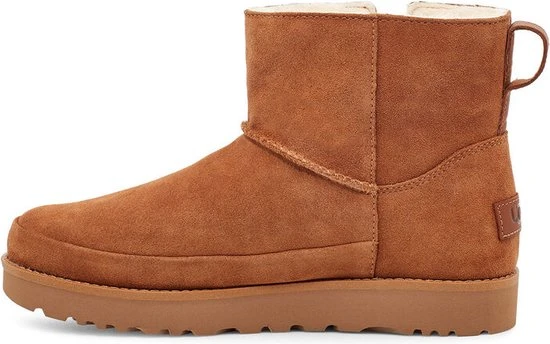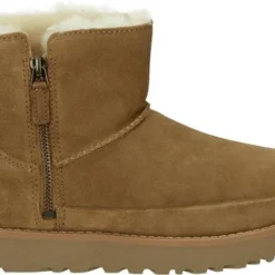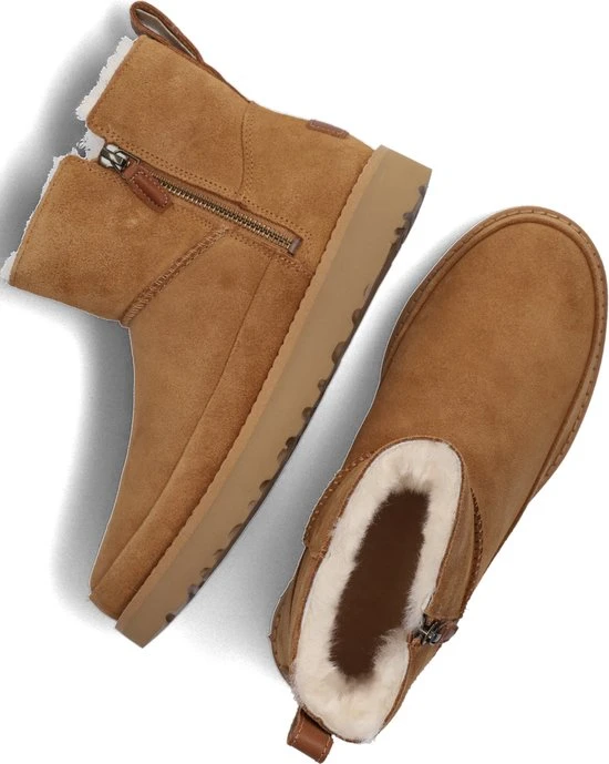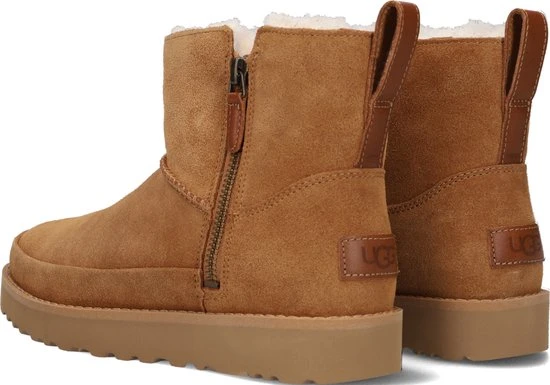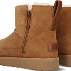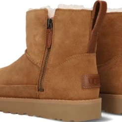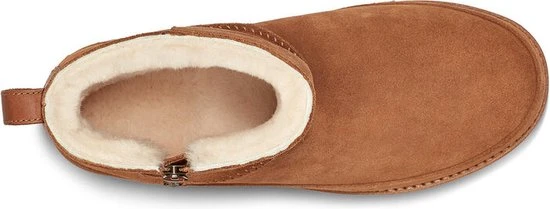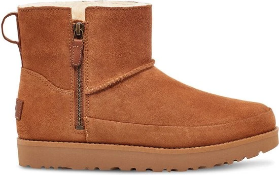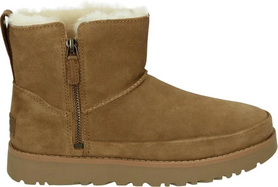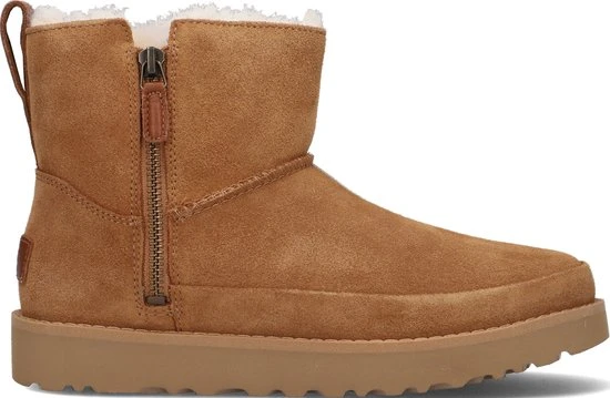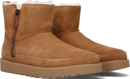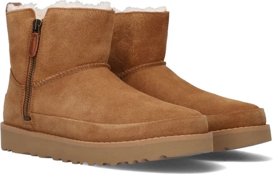 Dit artikel betreft een dameslaarzen vachtgevoerd laag van het merk UGG. De modelnaam is CLASSIC ZIP MINI W en de kleur is cognac. Het product heeft een wijdte G en een vast voetbed. De zool is van rubber en het materiaal bovenkant is van suede.