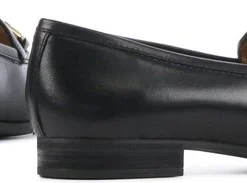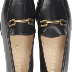 Zwarte loafer met gesp voor dames van het merk Unisa. Deze instapper is uitgevoerd in zwart leer. Op de neus van de schoen bevindt zich een decoratieve gesp. De binnenzijde is uitgevoerd in leer en een stevig contrefort draagt bij aan het loopcomfort. De rubberen zool heeft een glad profiel en de hak meet circa 1,5 cm.
