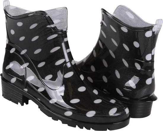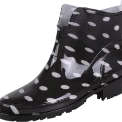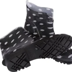 Zwarte regenlaarzen voor dames met een terugkerend patroon van witte stippen, over de enkel, met een haak om gemakkelijk aan te trekken.